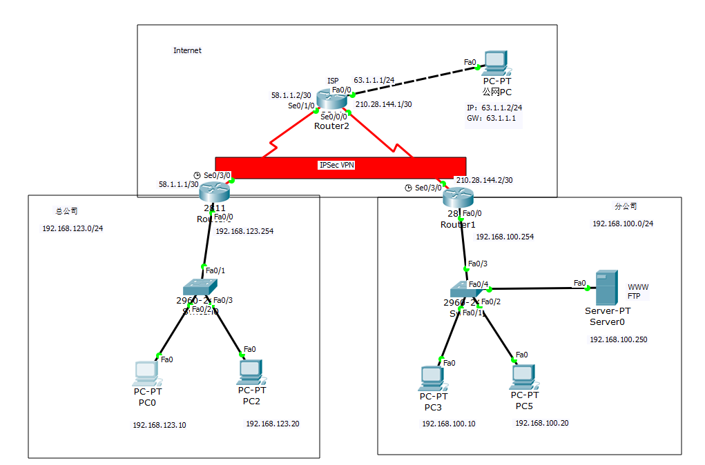 2、在总公司与分公司之间配置IPsec VPN,实现两地私有地址的内部网络之间可以实现相互通信。