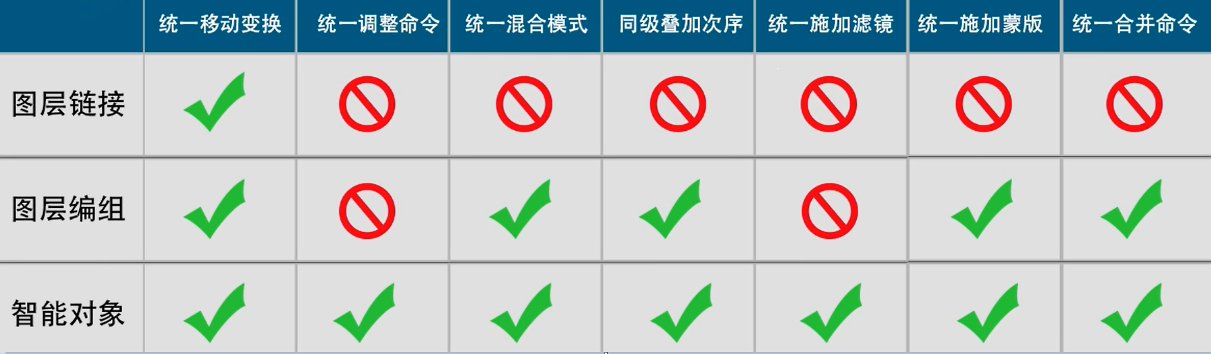 图层整合以后,图层群们是否具有统一的操作属性,详见此表: