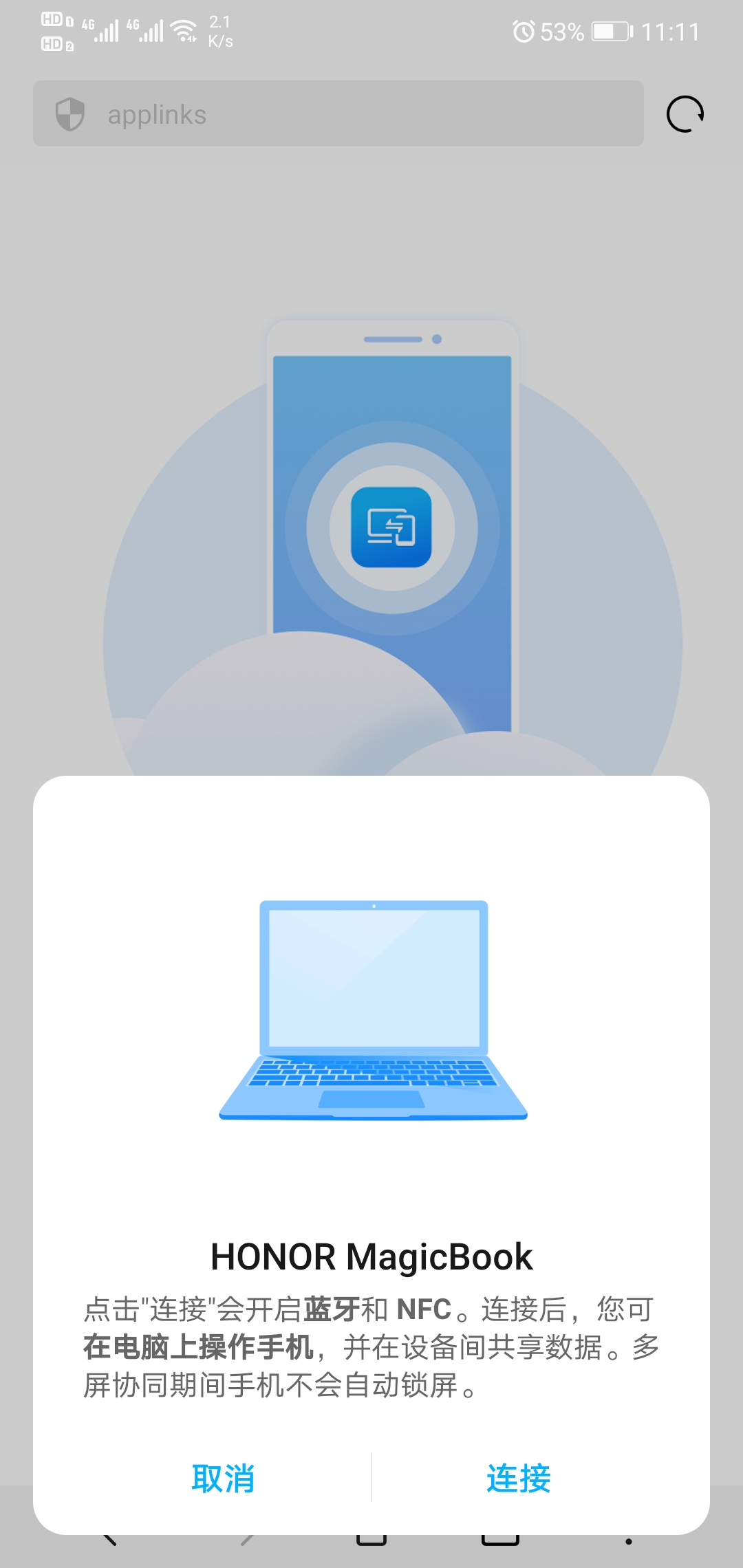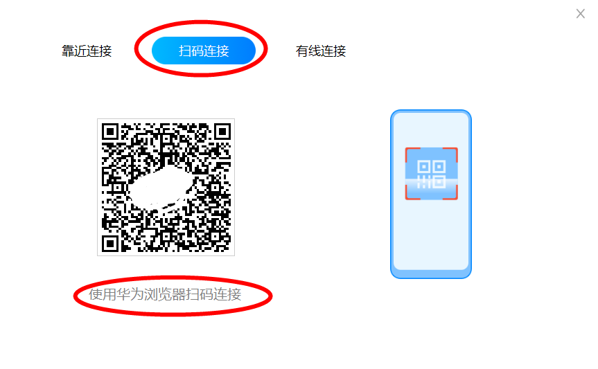 选择扫码连接,手机打开华为浏览器,扫码后点击连接。