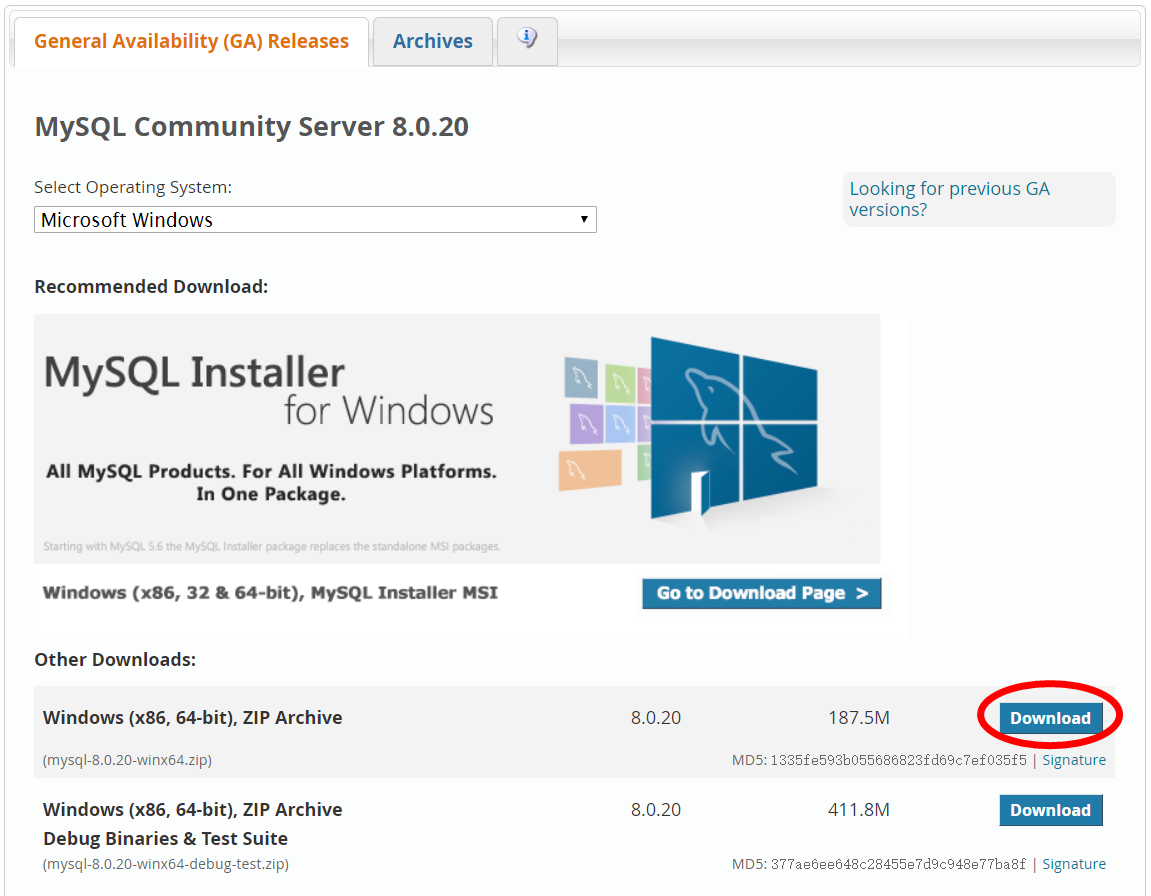首先我们到MySQL官网下载MySQL的压缩包,MySQL提供了压缩包和安装包两种方式,两种方式的区别是压缩包解压之后配置一下就可以使用,而.msi的安装包安装较为繁琐,故我们介绍压缩包的方式。
