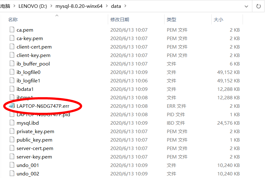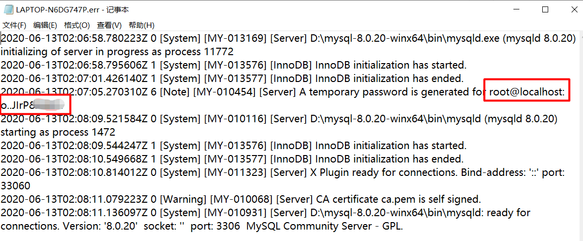 执行完上一步之后,在data目录下生的文件有一个.err文件,这里面有初始化的密码。我们编辑打开此文件,找到密码。该文件命名规则是【电脑用户名.err】如下图