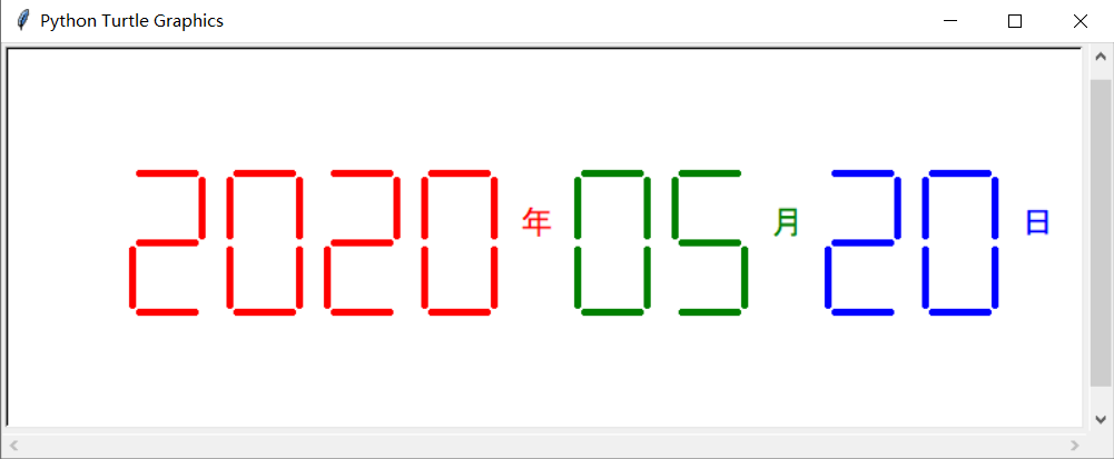 def DrawDate(date): turtle.pencolor("red") for i in date: if i == "-": turtle.write('年',font=("Arial",18,"normal")) turtle.pencolor("green") turtle.fd(40) elif i == "=": turtle.write('月',font=("Arial",18,"normal")) turtle.pencolor("blue") turtle.fd(40) elif i == "+": turtle.write('日',font=("Arial",18,"normal")) else: DrawDigits(eval(i)) def main(): turtle.setup(800,300) turtle.penup() turtle.fd(-300) turtle.pensize(5) DrawDate(time.strftime("%Y-%m=%d+",time.gmtime())) turtle.hideturtle() turtle.done() main()
